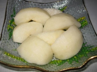 少し お腹の空きスペースが出来た頃に、デザート類を取りに行って木皿に盛りつけた。